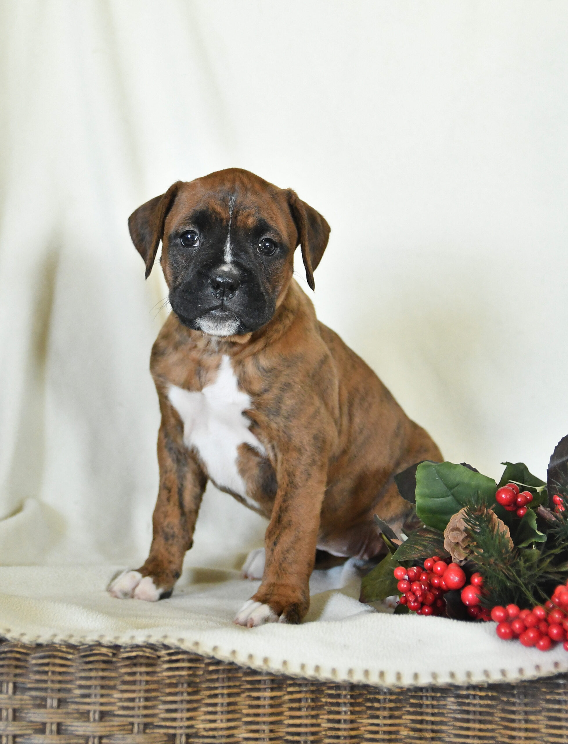 Boxer puppies have a muscular, athletic build with a distinctive square-shaped head and short muzzle. They typically come in fawn (tan to reddish-brown) or brindle colors, often with white markings on their face, chest, and paws.